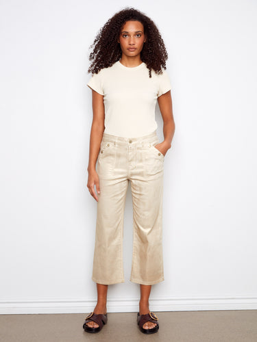 Foiled Cropped Twill Pants With Snap Button Detail - Natural