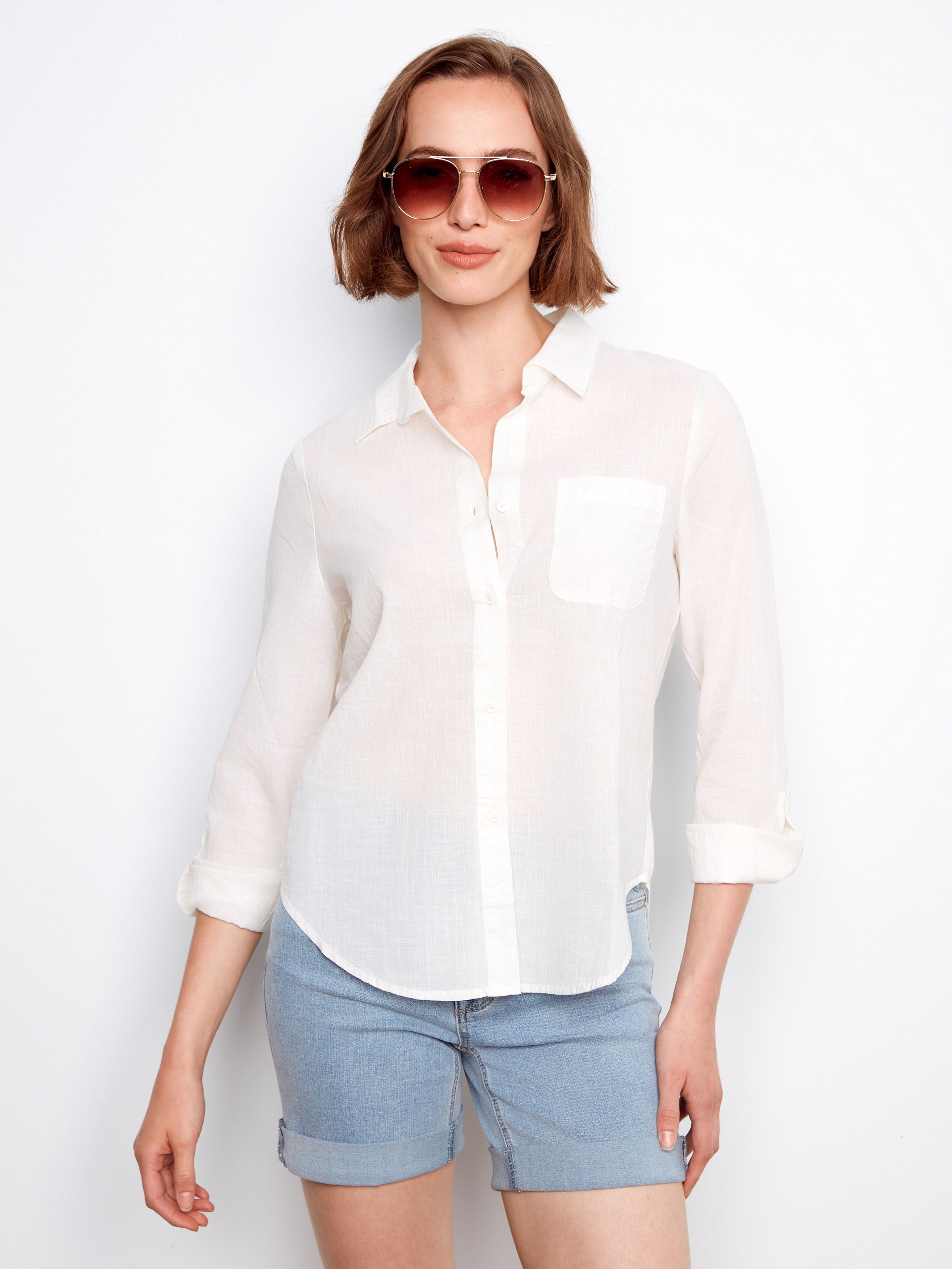 Elevate your wardrobe with this essential long-sleeve white shirt, designed for effortless versatility. Featuring a classic shirt collar and chest pocket, its roll-up sleeves offer adaptable styling from day to night. Timeless and easy to wear, it blends polished elegance with everyday ease for the spring-summer season.