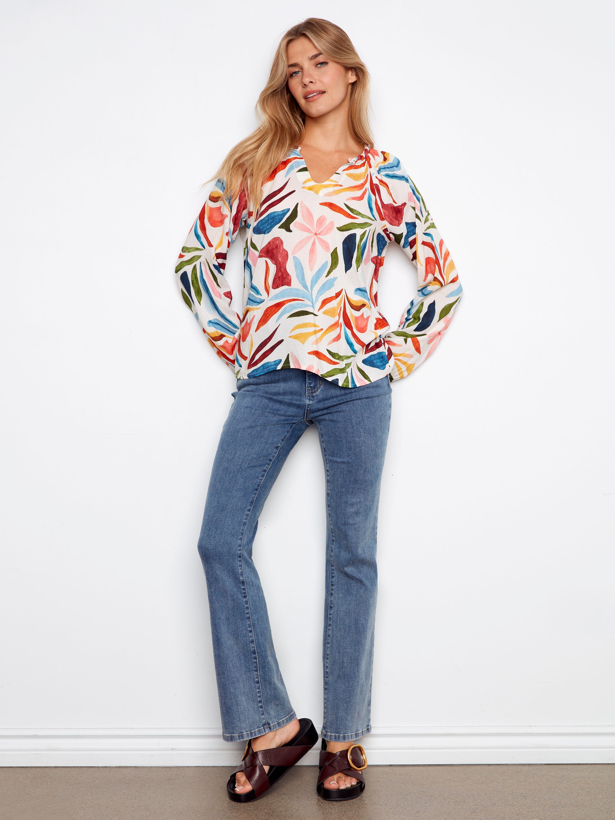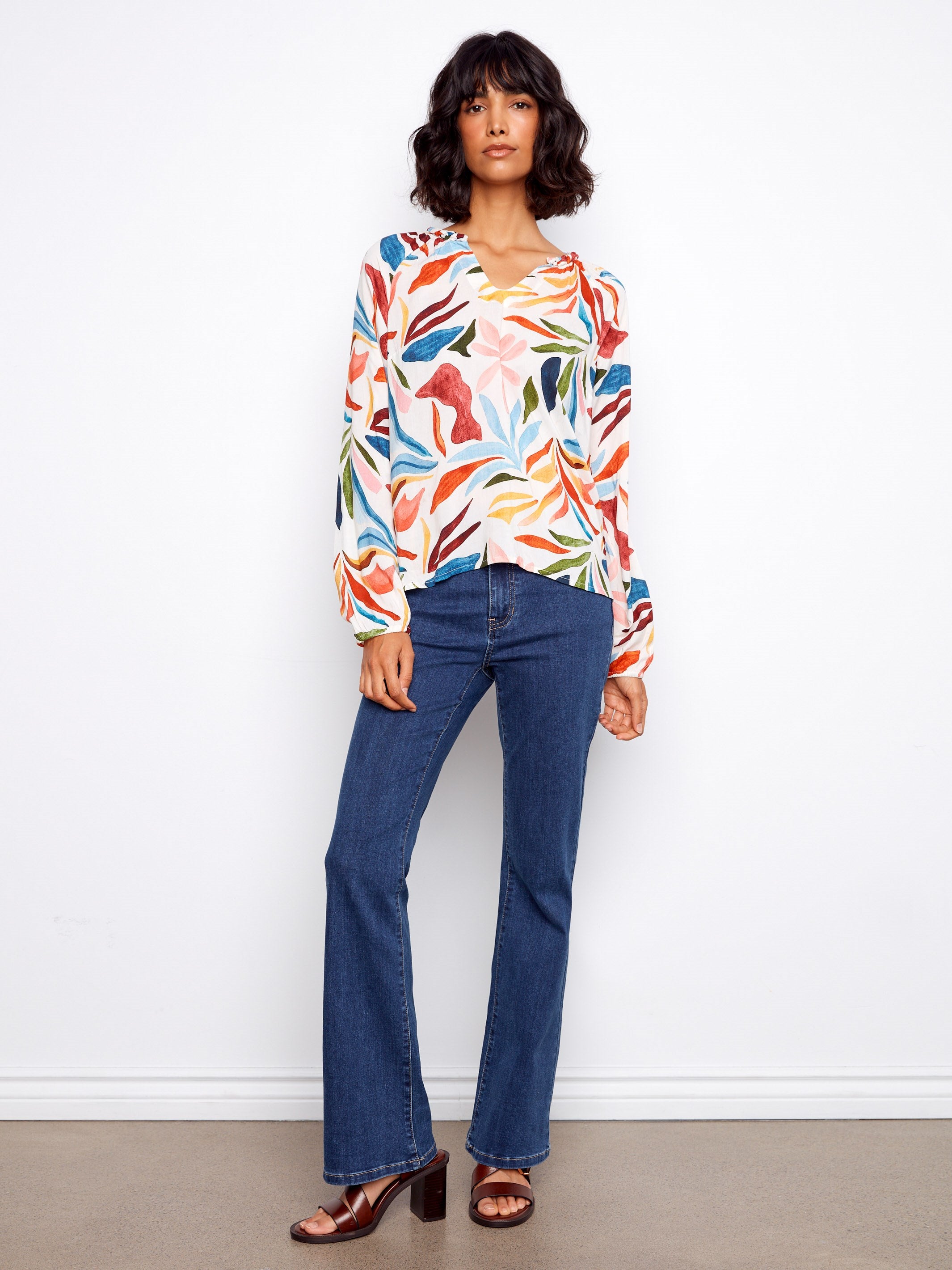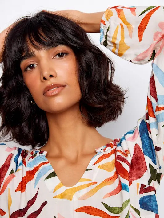 Embrace your bohemian spirit with this vibrant popover blouse. Designed with relaxed raglan sleeves and a flattering notched neckline, it offers an effortless, easygoing silhouette. The colorful Solstice print adds a playful touch, making it a standout piece for your spring-summer wardrobe. Perfect for a casual brunch or an afternoon stroll, it pairs comfort with carefree style.
