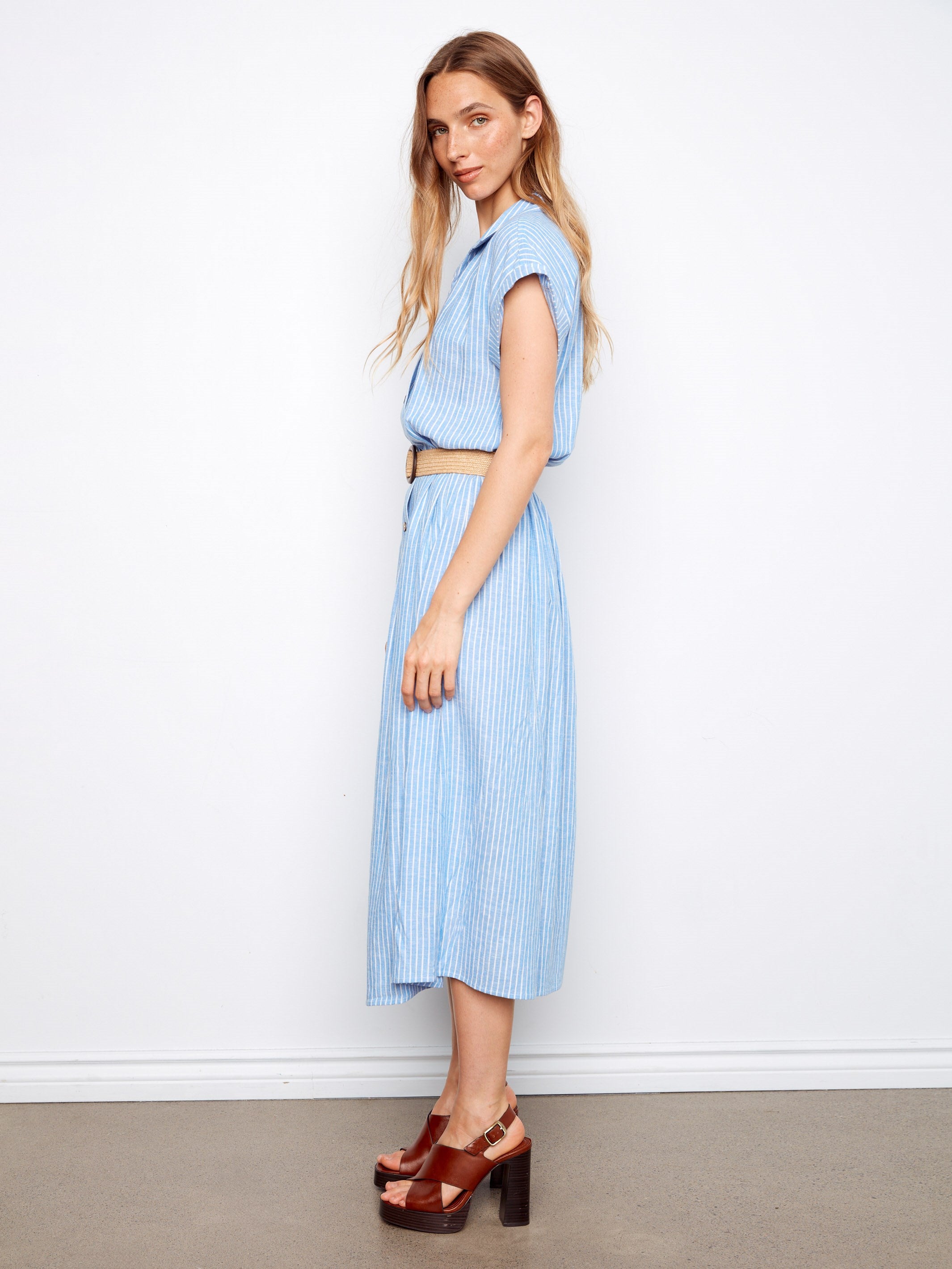 Embrace effortless summer style with this striped maxi dress, crafted from a breathable linen blend for a light, relaxed fit. A button-front design and straw belt add a touch of natural elegance, while the soft bluebell hue enhances its charm. Perfect for market strolls or seaside outings, it’s a warm-weather essential.